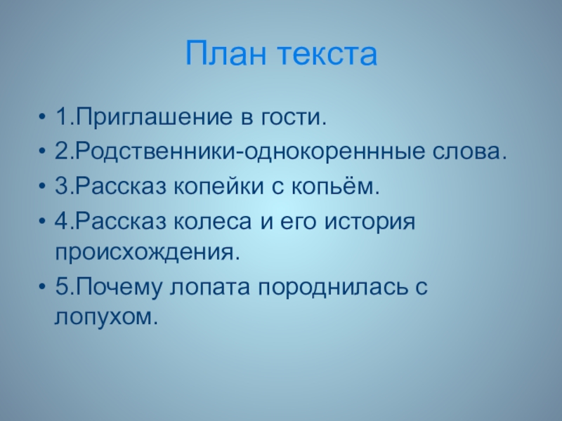 План текста1.Приглашение в гости.2.Родственники-однокореннные слова.3.Рассказ копейки с копьём.4.Рассказ колеса и его история происхождения.5.Почему лопата породнилась с лопухом.