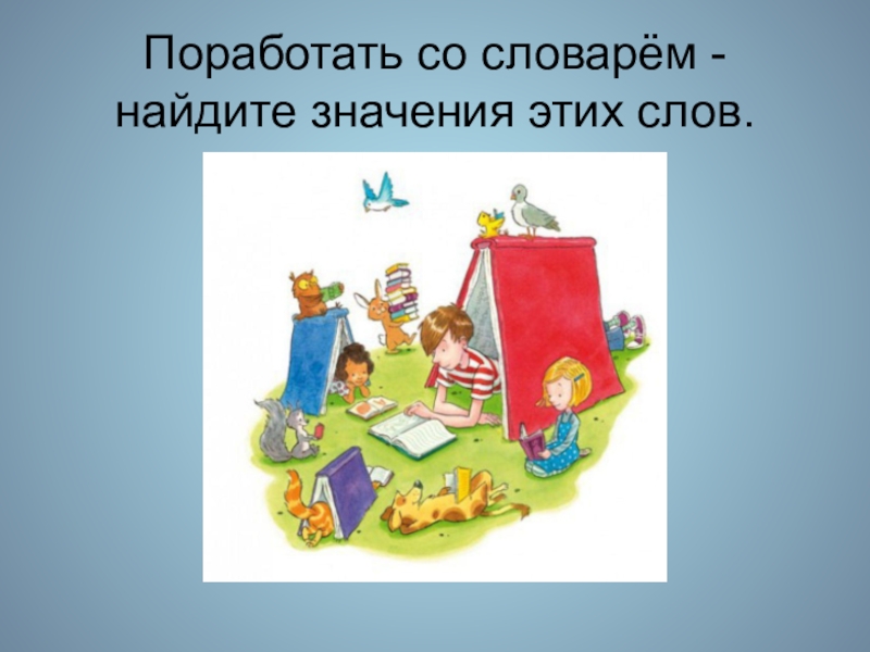 Слайд 10Поработать со словарём -найдите значения этих слов.