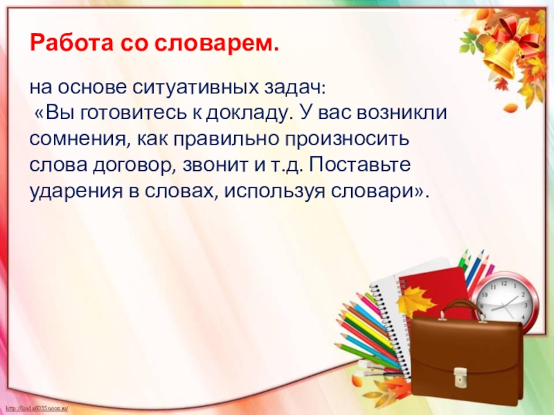 вас возникли сомнения, как правильно произносить слова договор, звонит и т.д. Поставьте ударения в словах, используя словари».