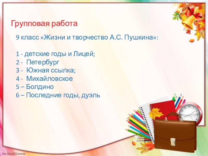 9 класс «Жизни и творчество А.С. Пушкина»:
