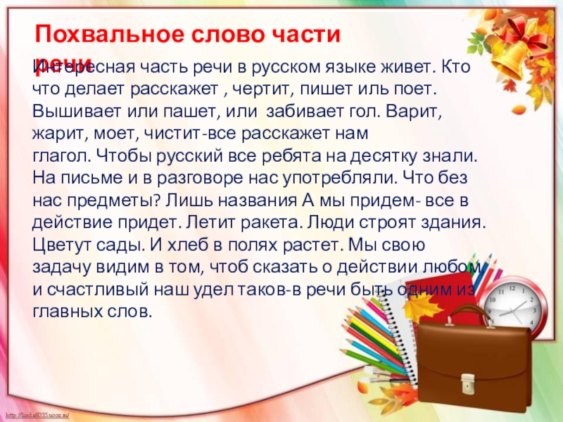 что делает расскажет , чертит, пишет иль поет. Вышивает или пашет, или забивает гол. Варит, жарит, моет, чистит-все расскажет нам глагол. Чтобы русский все ребята на десятку знали. На письме и в разговоре нас употребляли. Что без нас предметы? Лишь названия А мы придем- все в действие придет. Летит ракета. Люди строят здания. Цветут сады. И хлеб в полях растет. Мы свою задачу видим в том, чтоб сказать о действии любом, и счастливый наш удел таков-в речи быть одним из главных слов.