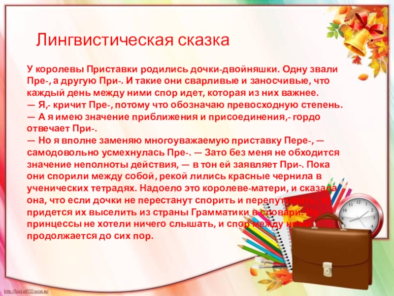 — Но я вполне заменяю многоуважаемую приставку Пере-, — самодовольно усмехнулась Пре-. — Зато без меня не обходится значение неполноты действия, — в тон ей заявляет При-. Пока они спорили между собой, рекой лились красные чернила в ученических тетрадях. Надоело это королеве-матери, и сказала она, что если дочки не перестанут спорить и перепутывать, то придется их выселить из страны Грамматики в словари. Но принцессы не хотели ничего слышать, и спор между ними продолжается до сих пор.