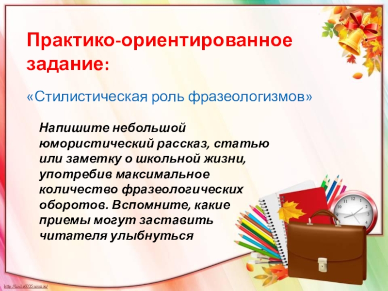 о школьной жизни, употребив максимальное количество фразеологических оборотов. Вспомните, какие приемы могут заставить читателя улыбнуться