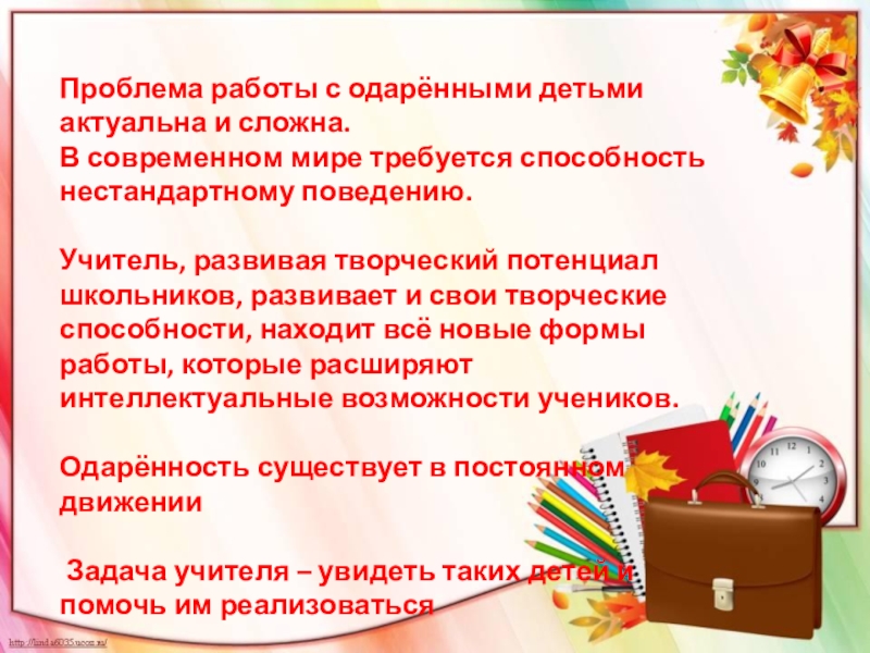 Слайд 18Проблема работы с одарёнными детьми актуальна и сложна.