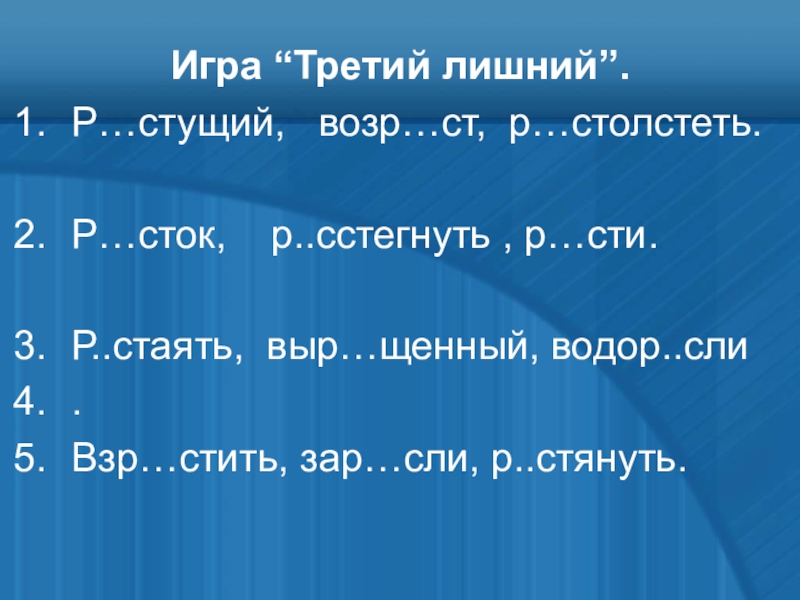 Игра “Третий лишний”. Р…стущий,  возр…ст, р…столстеть.Р…сток,  р..сстегнуть , р…сти.Р..стаять, выр…щенный, водор..сли.Взр…стить, зар…сли, р..стянуть.