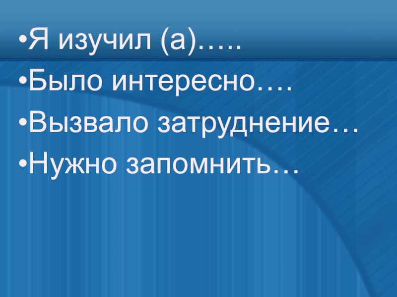 Я изучил (а)…..Было интересно….Вызвало затруднение…Нужно запомнить…