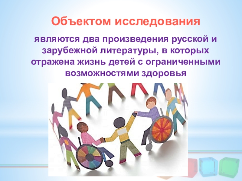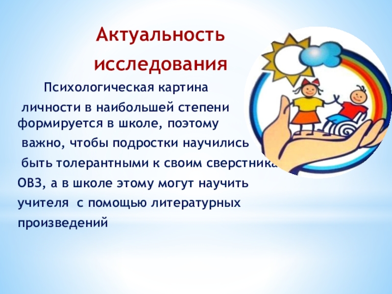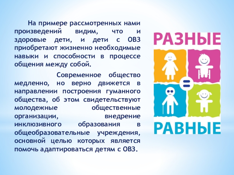 возможностями или не интересуются такими детьми, ведь дети с ограниченными возможностями обучаются индивидуально, и мы практически о них ничего не знаем. А может, недостаточно произведений написано о таких детях или они не включены в школьную программу?