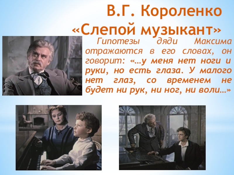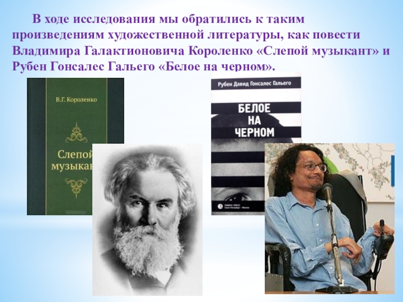 повести Владимира Галактионовича Короленко «Слепой музыкант» и Рубен Гонсалес Гальего «Белое на черном».
