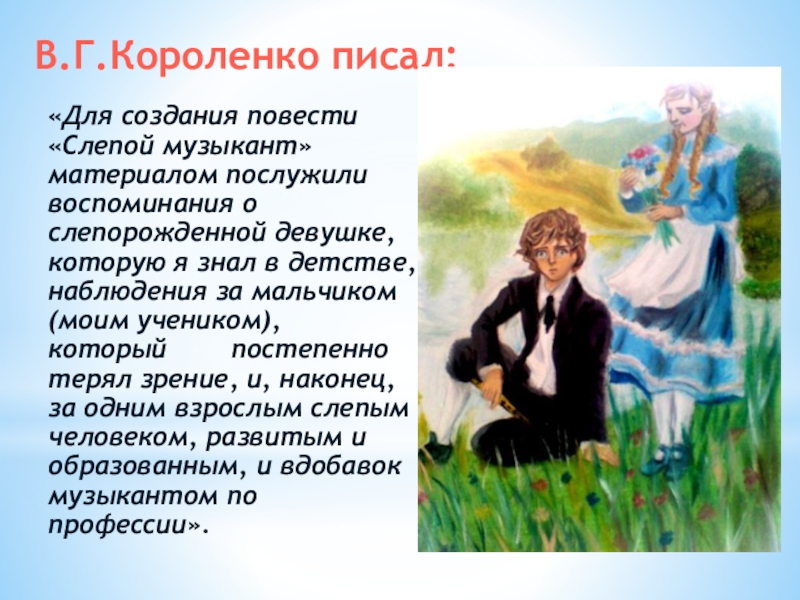«Для создания повести «Слепой музыкант» материалом послужили воспоминания о