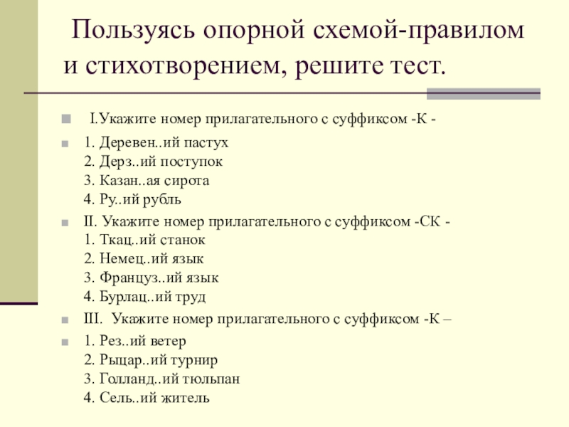 Пользуясь опорной схемой-правилом и стихотворением, решите тест.   I.Укажите номер прилагательного с суффиксом -К