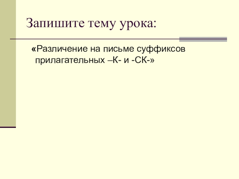 Запишите тему урока: «Различение на письме суффиксов прилагательных –К- и -СК-»