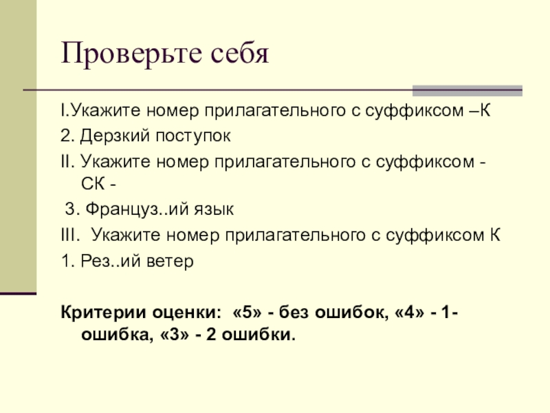 Проверьте себяI.Укажите номер прилагательного с суффиксом –К2. Дерзкий поступок II. Укажите номер прилагательного с суффиксом -СК -   3. Француз..ий