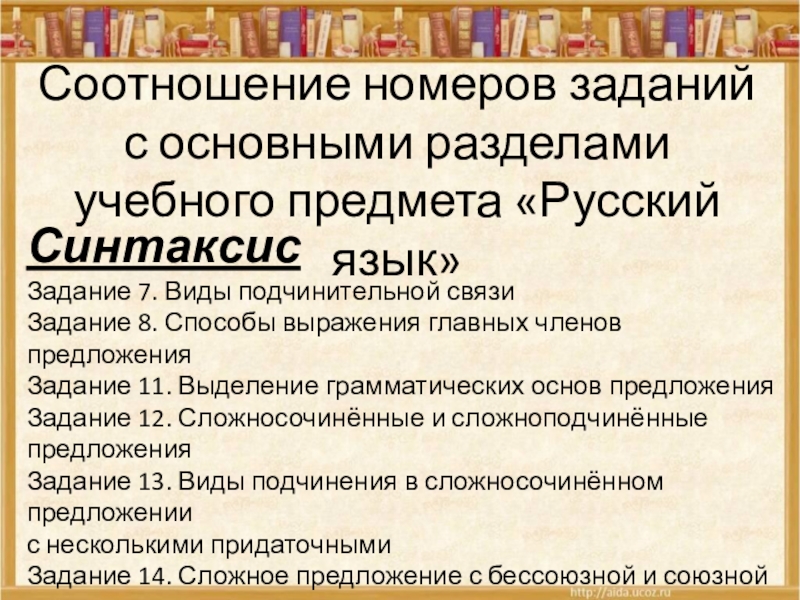 Слайд 9Соотношение номеров заданий с основными разделами учебного предмета «Русский язык»