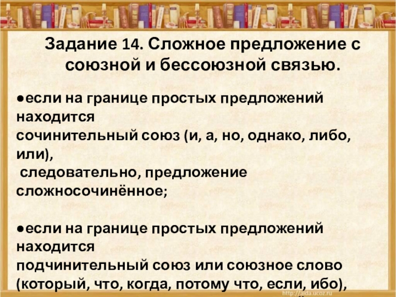 Задание 14. Сложное предложение с бессоюзной и союзной связью