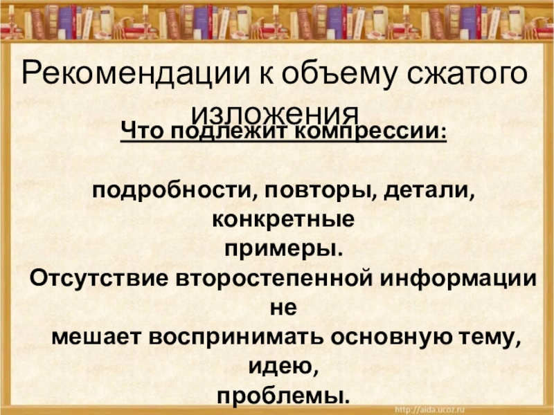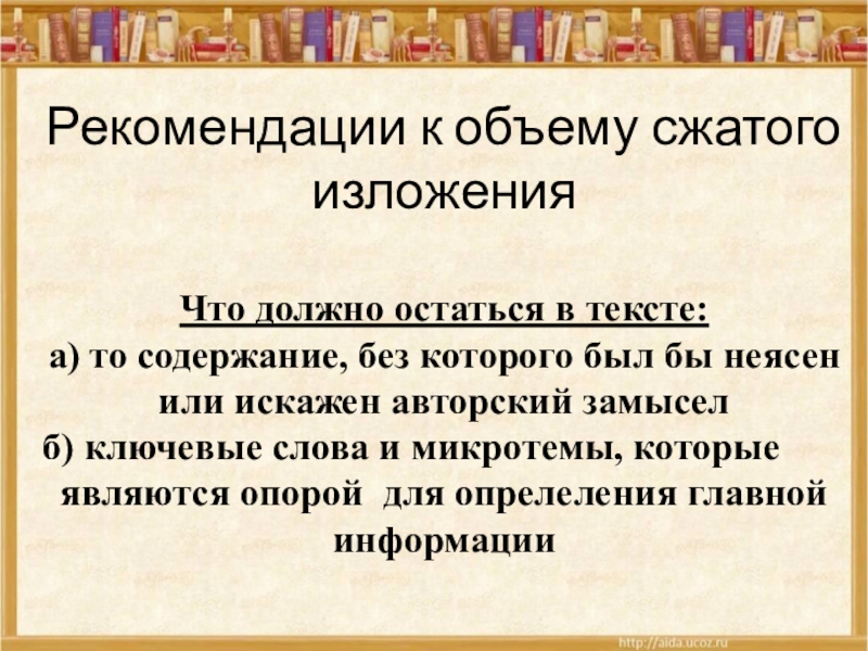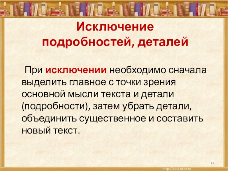 с точки зрения основной мысли текста и детали (подробности), затем убрать детали, объединить существенное и составить новый текст.
