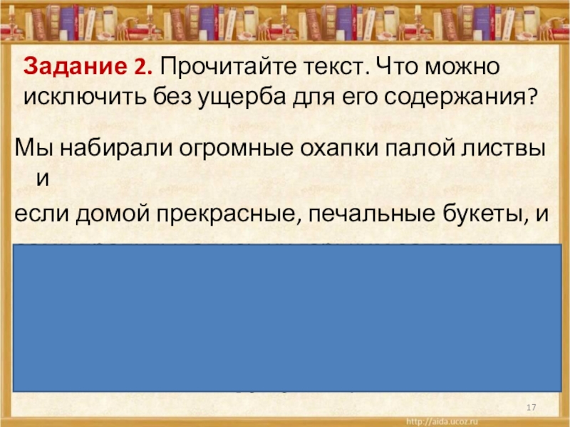 Слайд 17Задание 2. Прочитайте текст. Что можно исключить без ущерба для его