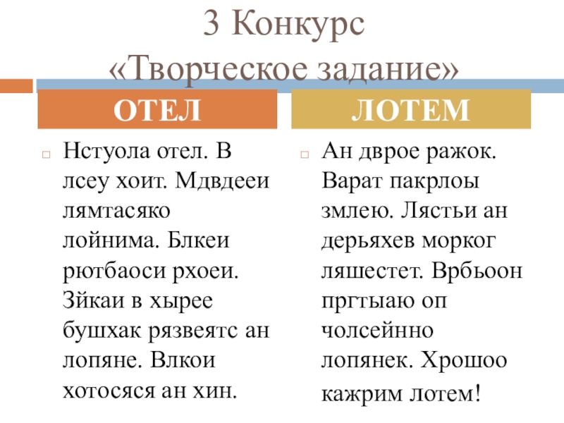 Ан дврое ражок. Варат пакрлоы змлею. Лястьи ан дерьяхев морког ляшестет. Врбьоон пргтыаю оп чолсейнно лопянек. Хрошоо кажрим лотем!