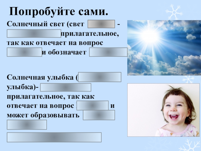 Попробуйте сами.Солнечный свет (свет солнца) -относительное прилагательное, так как отвечает на вопрос КАКОЙ? и обозначает материалСолнечная улыбка