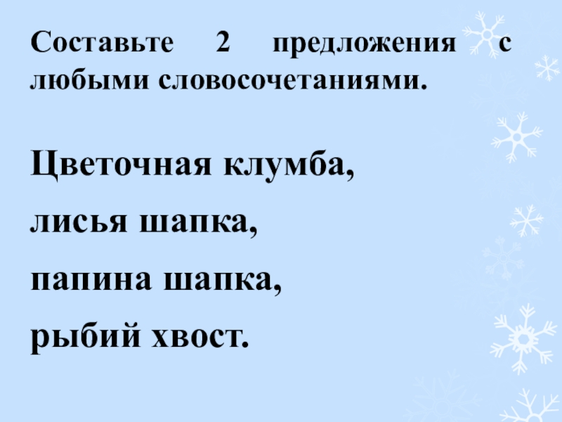 Составьте 2 предложения с любыми словосочетаниями.Цветочная клумба, лисья шапка, папина шапка, рыбий хвост.
