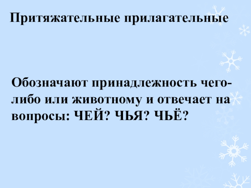 Притяжательные прилагательныеОбозначают принадлежность чего-либо или животному и отвечает на вопросы: ЧЕЙ? ЧЬЯ? ЧЬЁ?