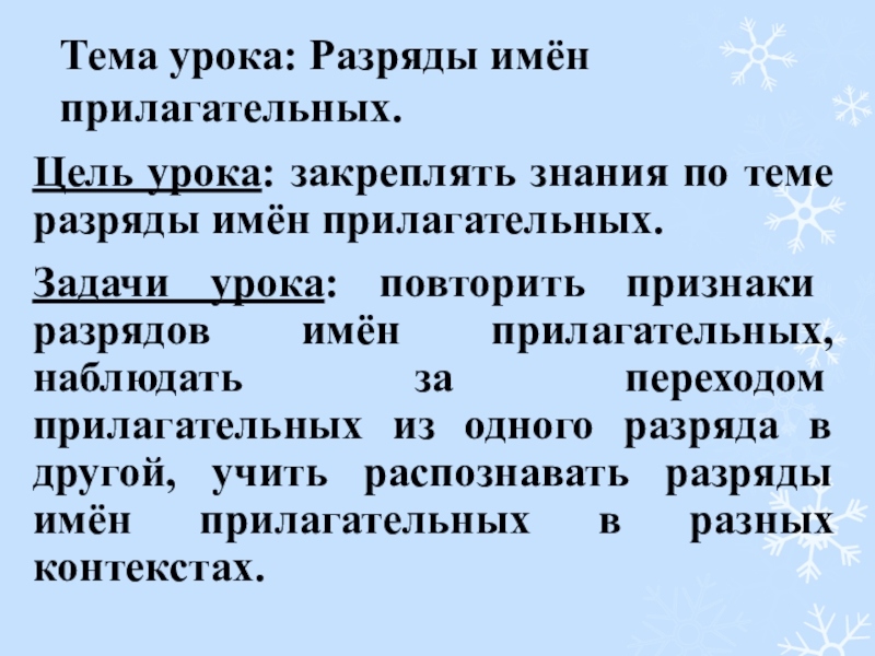 Задачи урока: повторить признаки разрядов имён прилагательных, наблюдать за переходом прилагательных из одного разряда в другой, учить распознавать разряды имён прилагательных в разных контекстах.