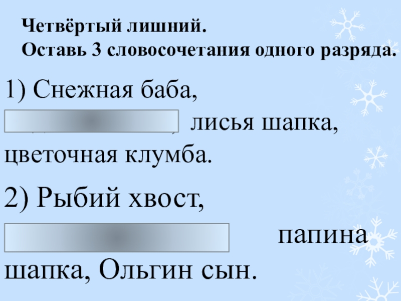 Четвёртый лишний.  Оставь 3 словосочетания одного разряда.1) Снежная баба,      медвежья лапа,