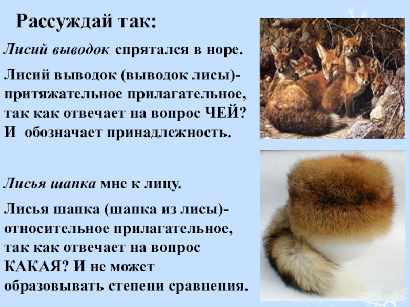 Мы видим, что притяжательное прилагательное ЛИСИЙ перешло в разряд относительных прилагательных.