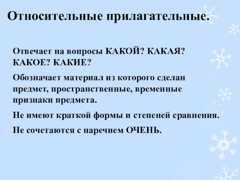 Относительные прилагательные.Отвечает на вопросы КАКОЙ? КАКАЯ? КАКОЕ? КАКИЕ?Обозначает материал из которого сделан предмет, пространственные, временные признаки предмета.Не