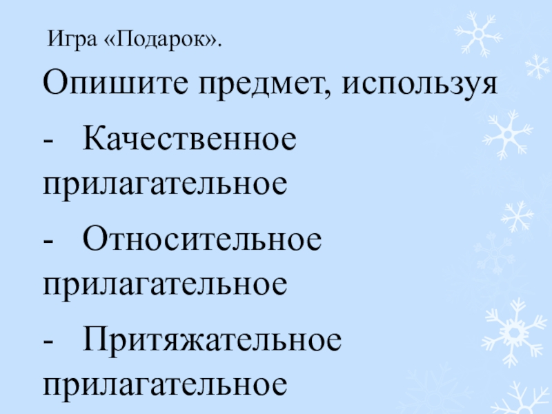 Игра «Подарок».Опишите предмет, используя-  Качественное прилагательное-  Относительное прилагательное-  Притяжательное прилагательное