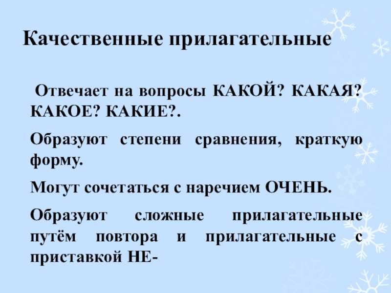 Качественные прилагательные Отвечает на вопросы КАКОЙ? КАКАЯ? КАКОЕ? КАКИЕ?. Образуют степени сравнения, краткую форму.Могут сочетаться с наречием