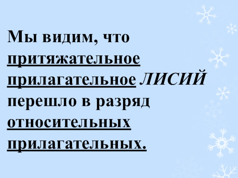 Слайд 12Мы видим, что притяжательное прилагательное ЛИСИЙ перешло в разряд относительных прилагательных.