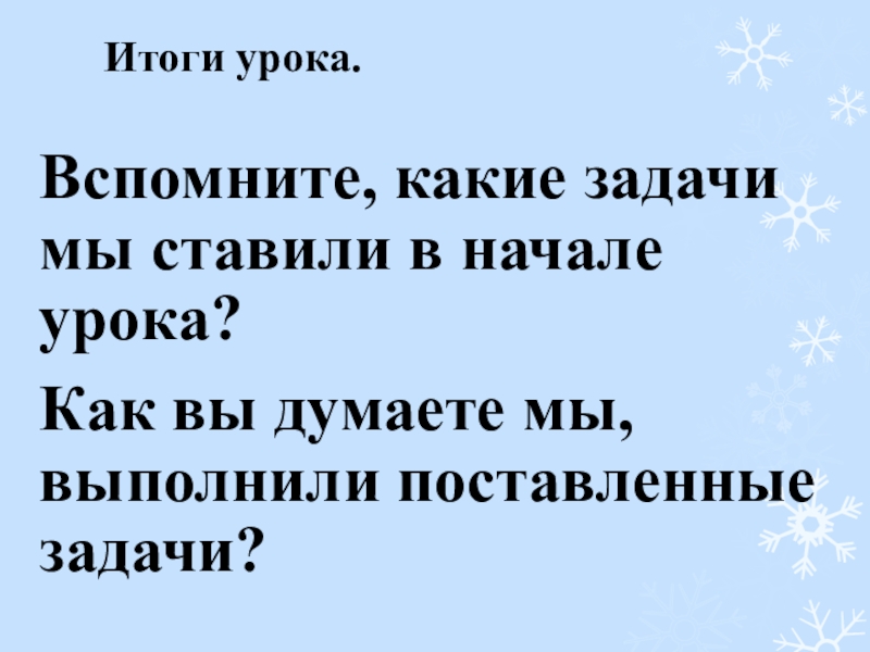 Итоги урока.Вспомните, какие задачи мы ставили в начале урока?Как вы думаете мы, выполнили поставленные задачи?