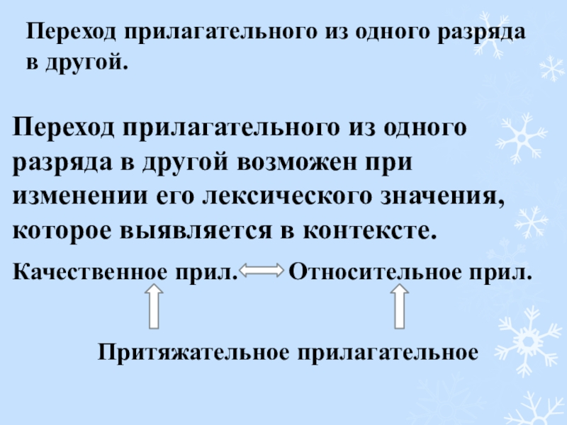 Переход прилагательного из одного разряда в другой.Переход прилагательного из одного разряда в другой возможен при изменении его