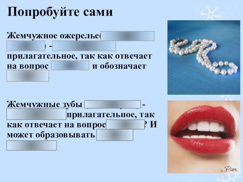 Попробуйте самиЖемчужное ожерелье(ожерелье из жемчуга) -относительное прилагательное, так как отвечает на вопрос КАКОЕ? и обозначает материал.Жемчужные зубы