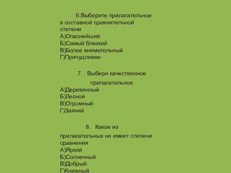 6.Выберите прилагательное в составной сравнительной степениА)ОпаснейшийБ)Самый близкийВ)Более внимательныйГ)Причудливее