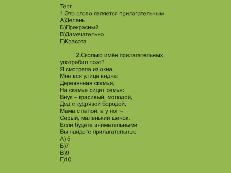 Тест1.Это слово является прилагательнымА)ЗеленьБ)ПрекрасныйВ)ЗамечательноГ)Красота      2.Сколько имён прилагательных употребил поэт?Я смотрела из окна, Мне