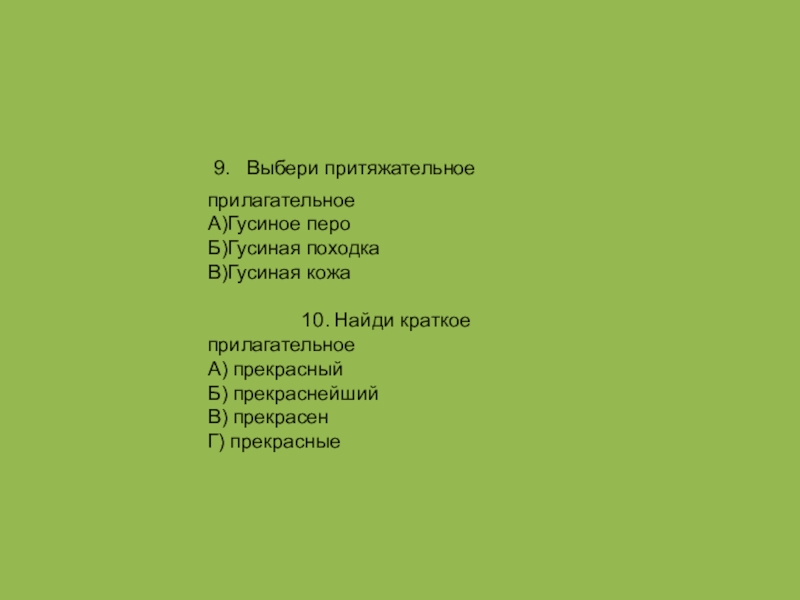 9. Выбери притяжательное прилагательноеА)Гусиное пероБ)Гусиная походкаВ)Гусиная кожа          10. Найди