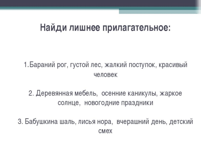 Я смотрела из окна, Мне вся улица видна:  Деревянная скамья,  На скамье сидит семья:  Внук – красивый, молодой,  Дед с кудрявой бородой, Мама с папой, а у ног –  Серый, маленький щенок. Если будете внимательными Вы найдете прилагательные