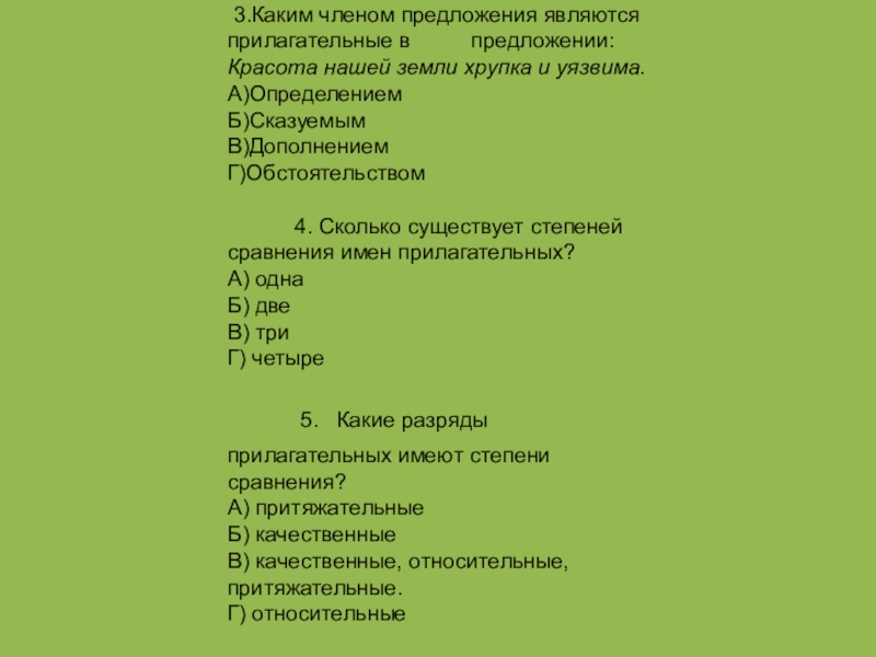 3.Каким членом предложения являются прилагательные в     предложении:  Красота нашей земли хрупка и