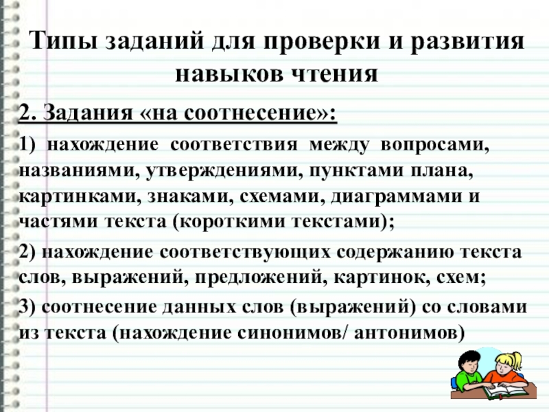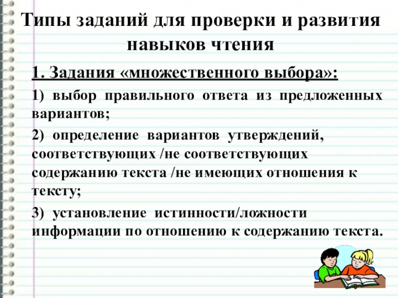 Слайд 32Типы заданий для проверки и развития навыков чтения