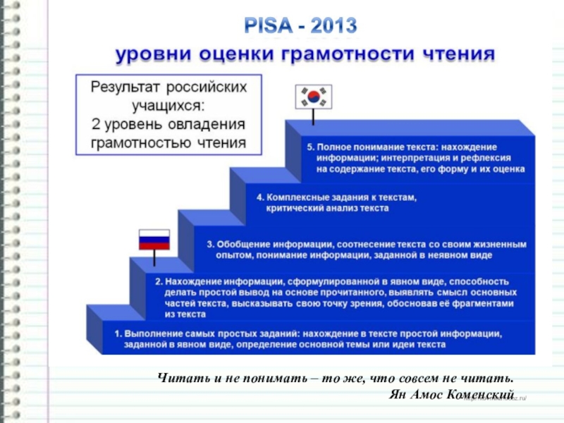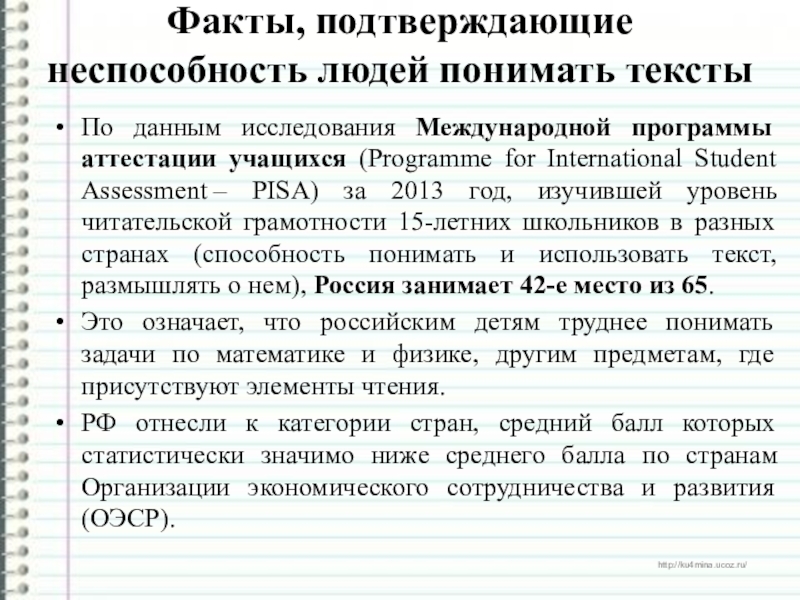 аттестации учащихся (Programme for International Student Assessment – PISA) за 2013 год, изучившей уровень читательской грамотности 15-летних школьников в разных странах (способность понимать и использовать текст, размышлять о нем), Россия занимает 42-е место из 65.