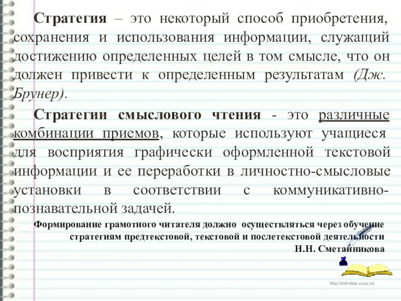 Стратегии смыслового чтения - это различные комбинации приемов, которые используют учащиеся для восприятия графически оформленной текстовой информации и ее переработки в личностно-смысловые установки в соответствии с коммуникативно-познавательной задачей.