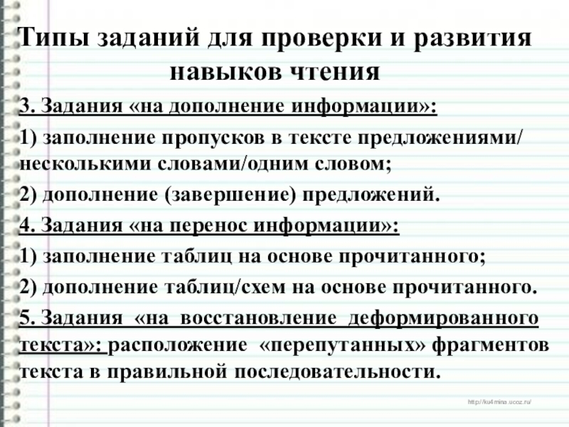 Слайд 31Типы заданий для проверки и развития навыков чтения