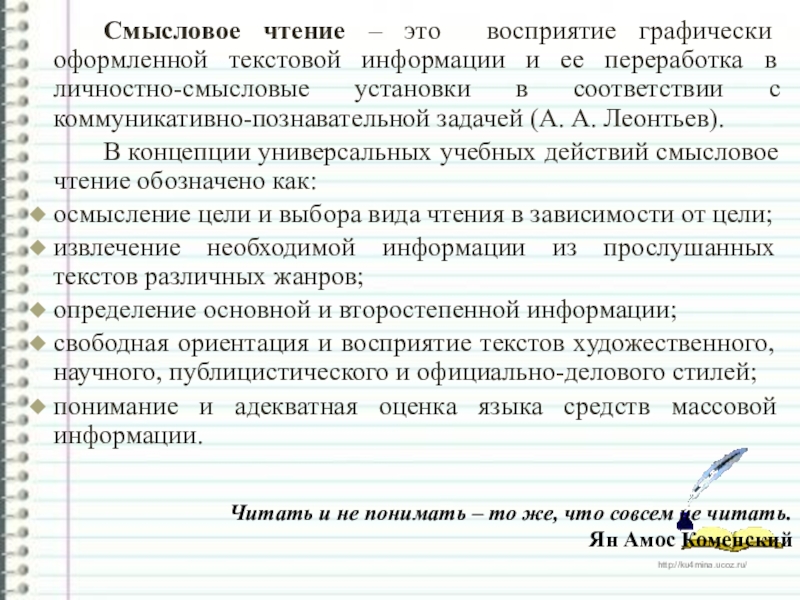 Слайд 6 Смысловое чтение – это восприятие графически оформленной текстовой информации и ее