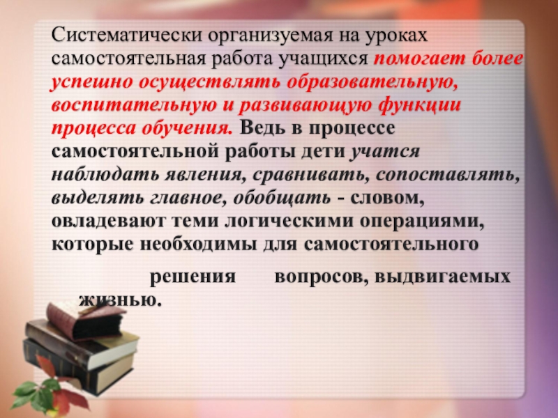 Слайд 7Систематически организуемая на уроках самостоятельная работа учащихся помогает более успешно осуществлять