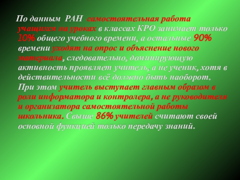 классах КРО занимает только 10% общего учебного времени, а остальные 90% времени уходят на опрос и объяснение нового материала, следовательно, доминирующую активность проявляет учитель, а не ученик, хотя в действительности всё должно быть наоборот. При этом учитель выступает главным образом в роли информатора и контролера, а не руководителя и организатора самостоятельной работы школьника. Свыше 86% учителей считают своей основной функцией только передачу знаний.