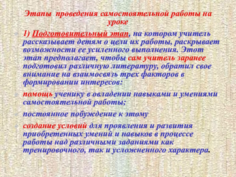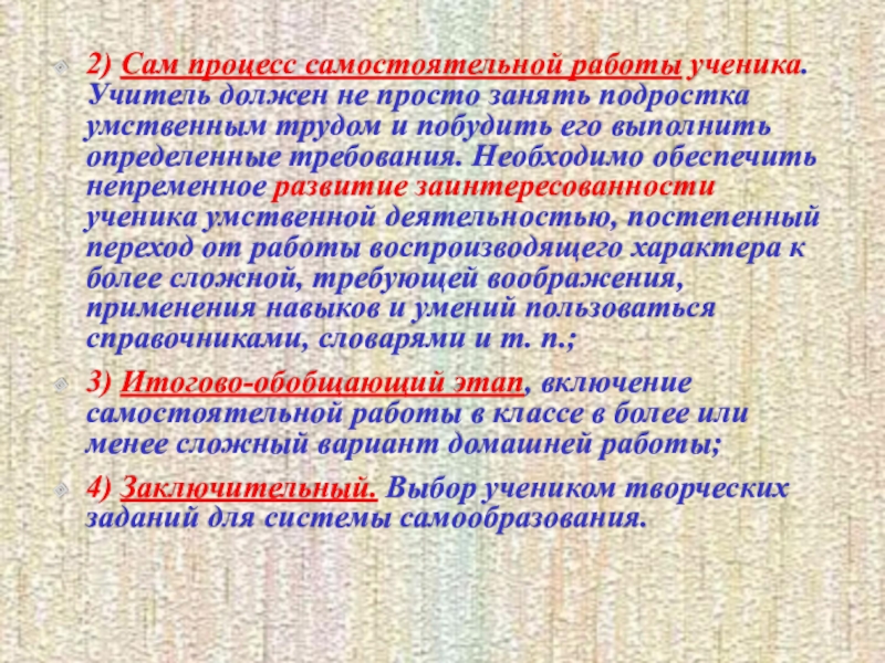 Слайд 142) Сам процесс самостоятельной работы ученика. Учитель должен не просто занять