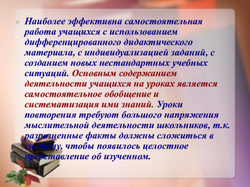 Слайд 8Наиболее эффективна самостоятельная работа учащихся с использованием дифференцированного дидактического материала, с