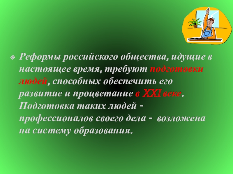 Реформы российского общества, идущие в настоящее время, требуют подготовки людей, способных