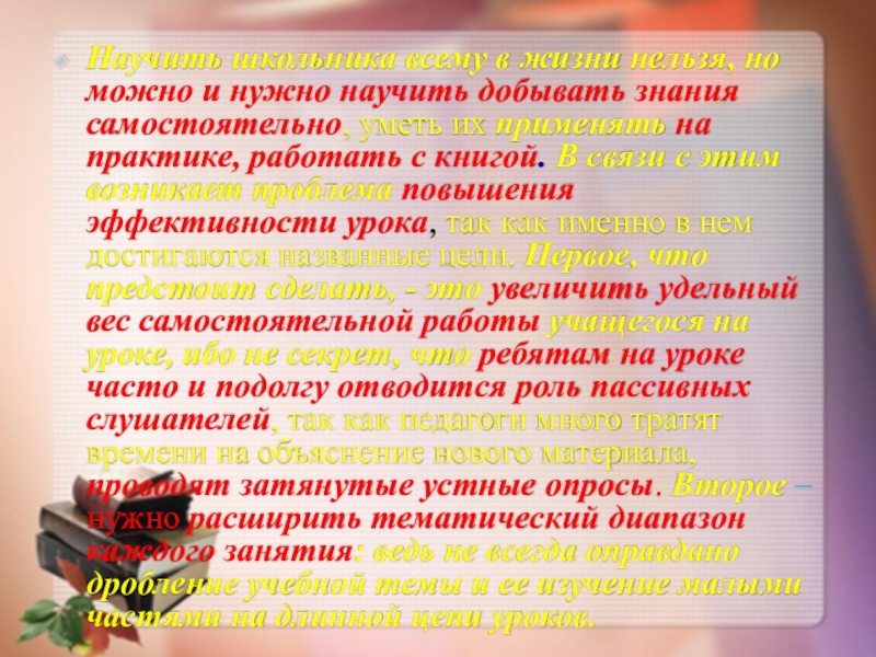 добывать знания самостоятельно, уметь их применять на практике, работать с книгой. В связи с этим возникает проблема повышения эффективности урока, так как именно в нем достигаются названные цели. Первое, что предстоит сделать, - это увеличить удельный вес самостоятельной работы учащегося на уроке, ибо не секрет, что ребятам на уроке часто и подолгу отводится роль пассивных слушателей, так как педагоги много тратят времени на объяснение нового материала, проводят затянутые устные опросы. Второе – нужно расширить тематический диапазон каждого занятия: ведь не всегда оправдано дробление учебной темы и ее изучение малыми частями на длинной цепи уроков.